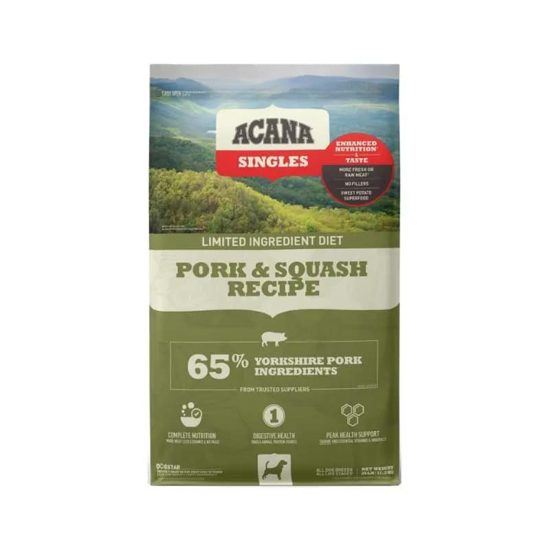 Nutrición de ingredientes limitados para estómagos sensibles. Acana Pork & Squash es una dieta biológicamente saludable de una sola fuente de proteína animal (cerdo Yorkshire), combinada con zapallo almizclero entero para una digestión ultra suave. Ideal para perros de todas las razas y etapas de la vida con alergias o intolerancias alimentarias.
