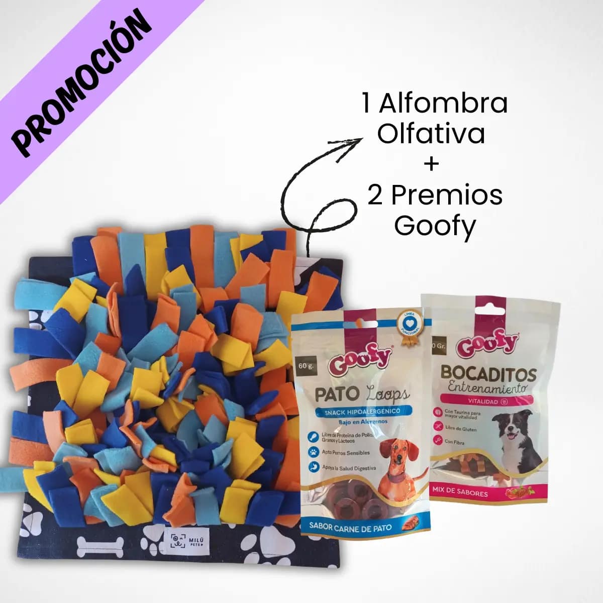 ¡El kit de búsqueda y enriquecimiento que tu perro necesita! La Promo Alfombra Olfativa incluye la alfombra de estimulación de 25×25 cm hecha a mano, más 2 paquetes de bocaditos de entrenamiento (loops de pato y mix de sabores) diseñados para ser usados en ella. Ideal para perros pequeños que necesitan un desafío mental y una forma de comer más lenta.