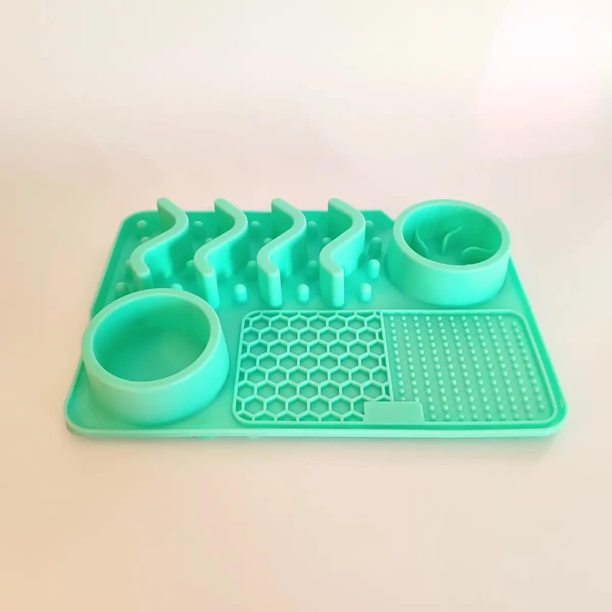 COMEDERO LENTO 4-EN-1 DE SILICONA (30X20 CM): Tapete multifuncional (LickiMat + Slow Feeder). Con chupones para adherir a ventanas o piso (uso vertical). Posee 4 zonas de desafío: laberinto, área de untar y dos cuencos de porciones. Congelable para aumentar la dificultad y reducir el estrés. ¡Enriquecimiento mental garantizado!